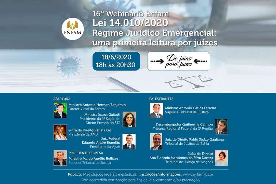 Evento, voltado para magistrados, ocorre na próxima quinta-feira (18) e tratará da nova lei sobre regime jurÃdico emergencial e transitório; inscriçõe...